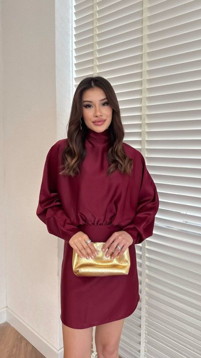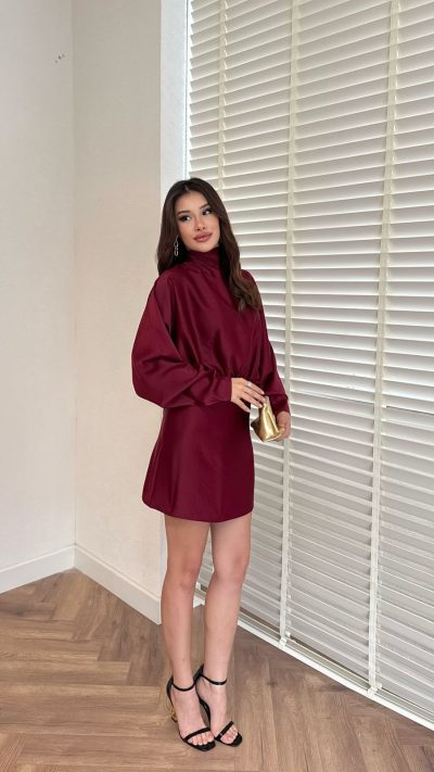 RED SHAWL DETAILED SLIT VELVET DRESS