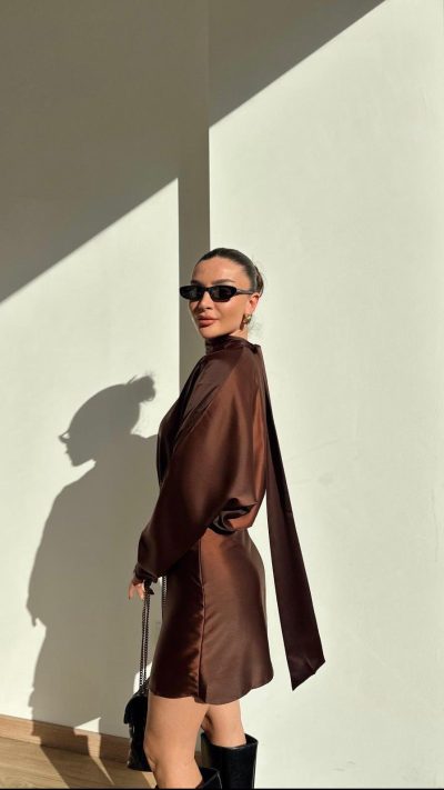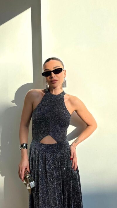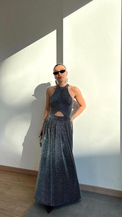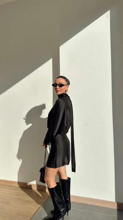 BLACK SHAWL DETAILED SLIT VELVET DRESS