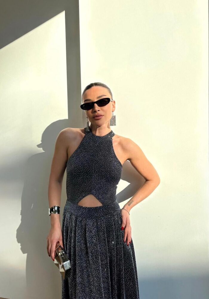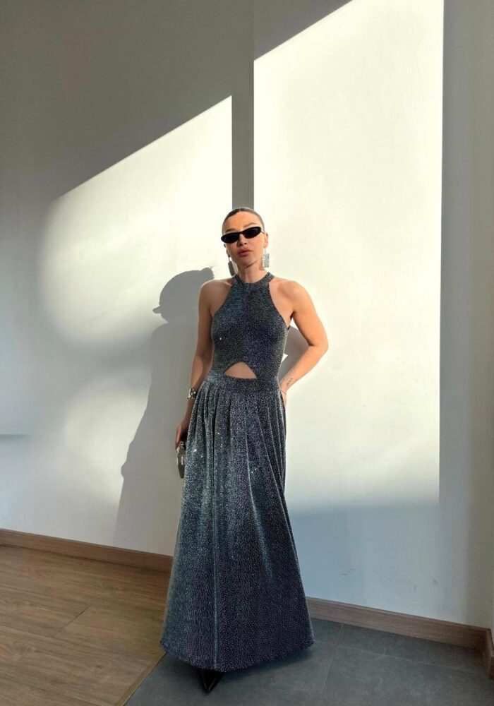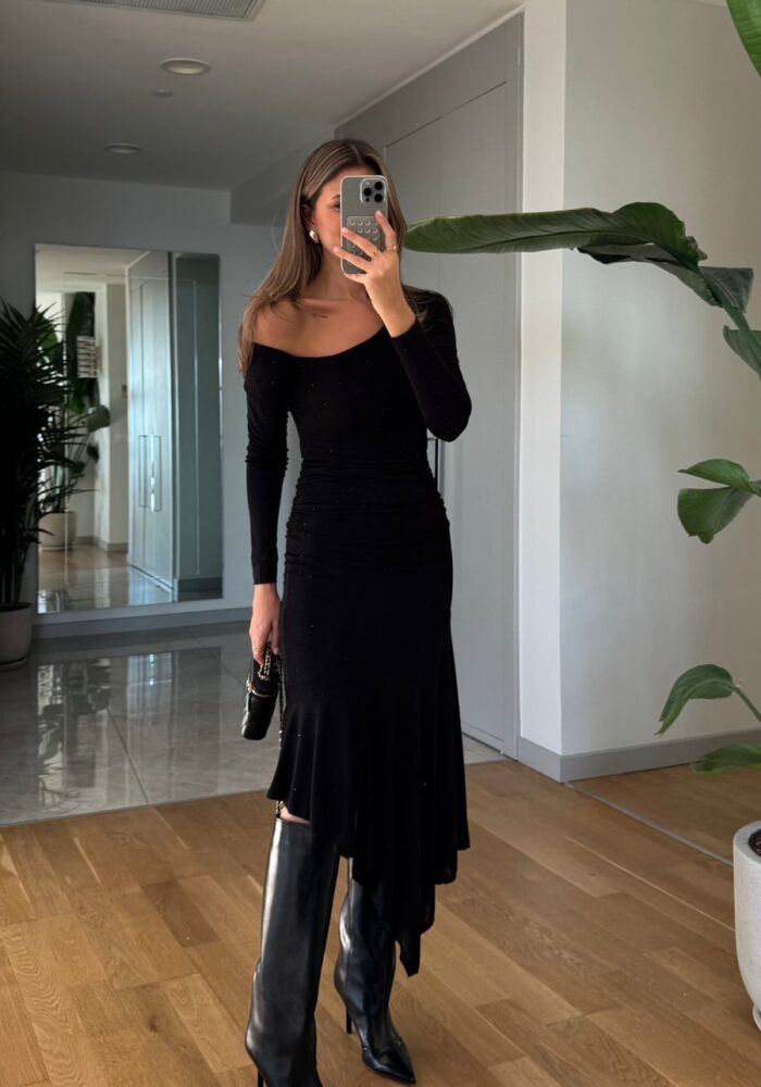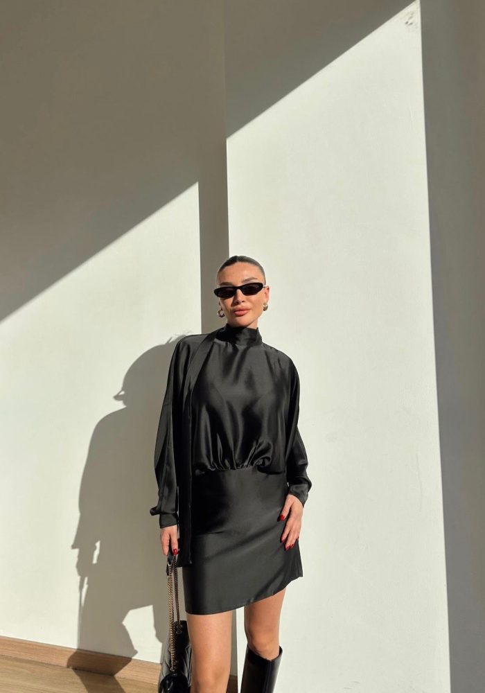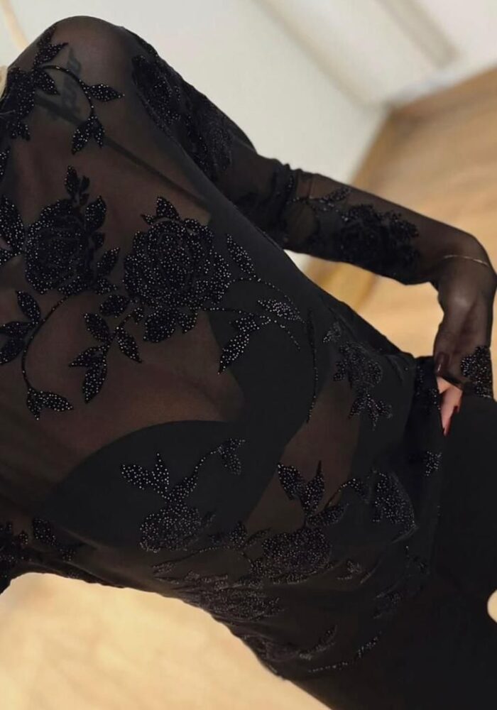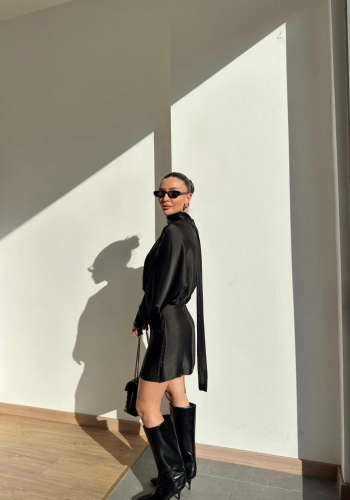 BLACK SHAWL DETAILED SLIT VELVET DRESS