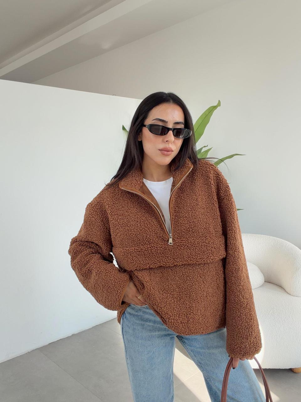 Brown Fleece Quarter Zip Pullover Sweater