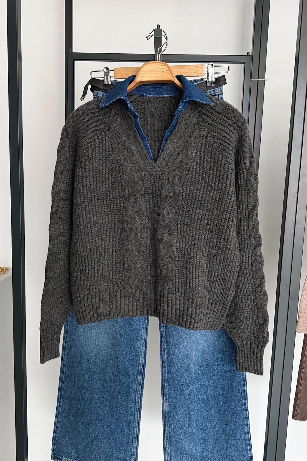 Denim-Collar Cable Knit – Grey