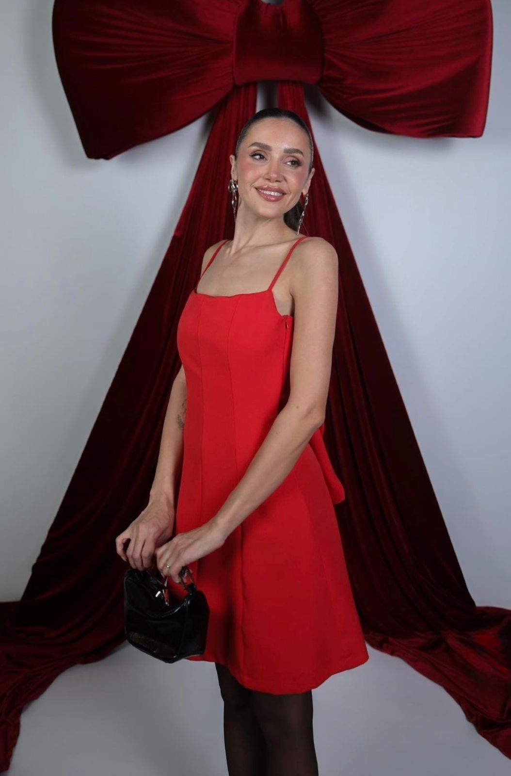 RED SHAWL DETAILED SLIT VELVET DRESS